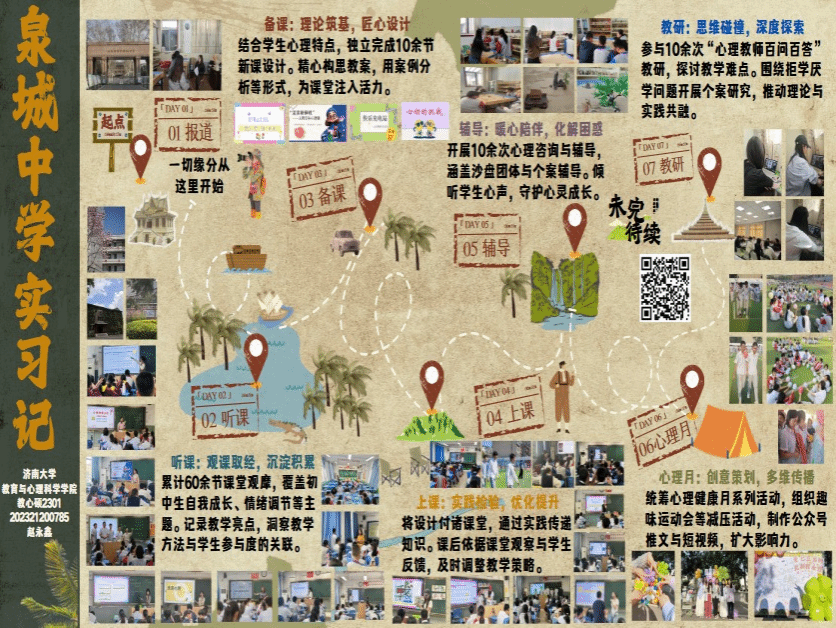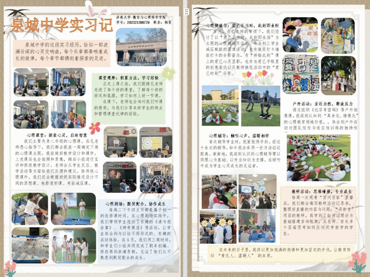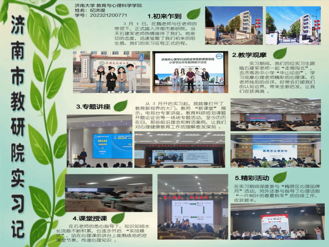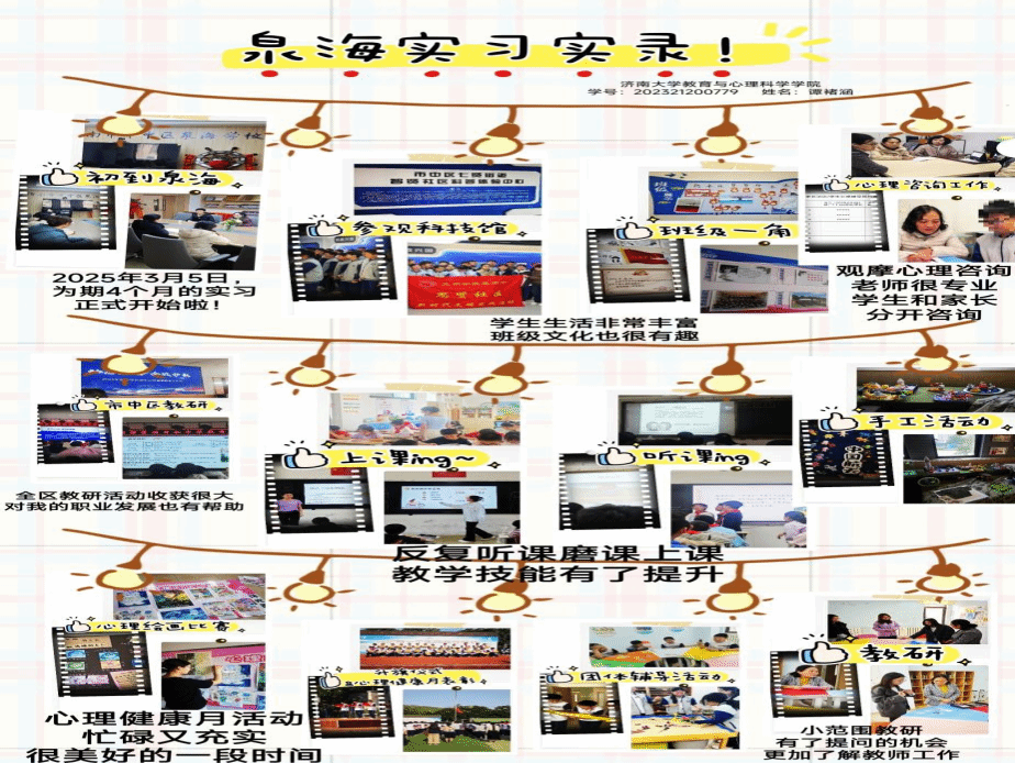 2025年春日,我院2023级的20名心理健康教育领域的研究生怀揣着对教育事业的满腔热忱奔赴山东各地实习。从济南市教研院到莱州金城中学,从济南泉城中学、济南泉海学校到济南泉景中学,从济南十六里河中学、济南第六十八中学到博山五岭路小学,他们严于律己,以身作则,在鲜活且真实的教育场景里,努力蜕变,最终圆满的地完成了从“准教师”到“真教师”的蜕变。这20名研究生坚定地在教育的肥沃土地上扎根,充分利用信息化教学手段,像是给学生课堂注入了活力的催化剂,让其瞬间焕发生机。