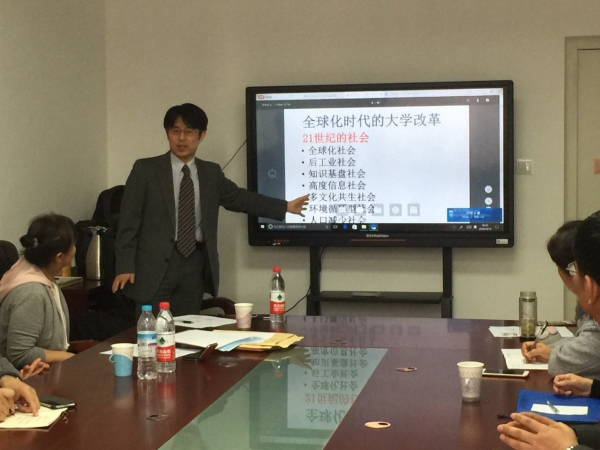 报告会上,上野正道教授以“全球化时代的高等教育与日本的教师教育”为主题,从全球化时代的大学改革、主动学习和素养教育、大学的教师教育和教师的专业性及大学教师教育的实践四方面进行阐述。他指出在全球化、信息化、技术创新的推进过程中,如何通过提升教师专业能力、转变教师角色和改善教师教育来提高教师的专业性适应未来教育变化趋势的问题,重点阐述了日本在国家政策层面的改革动向、日本学校在贯彻主动学习理念的实践案例。随后,上野正道教授与各位教师就报告内容进行了交流讨论。