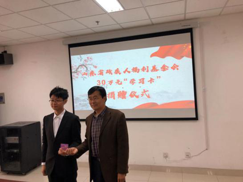 11月13号上午,山东省残疾人福利基金会副秘书长赵鲁、基金会项目一部副部长刘俊涛来我校教育与心理科学学院捐赠价值30万元的“学习卡”。教务处、教育与心理科学学院相关负责人参加了捐赠仪式。杨昭宁院长主持了捐赠仪式。