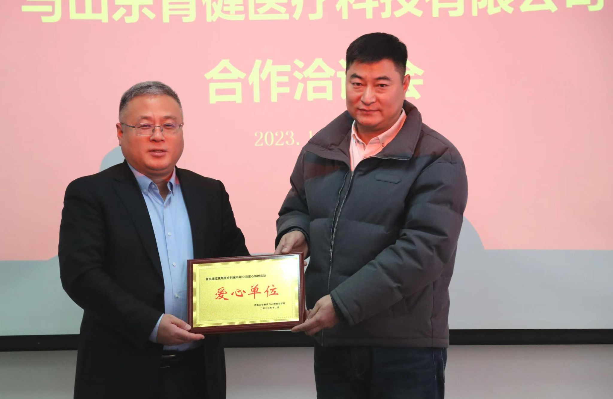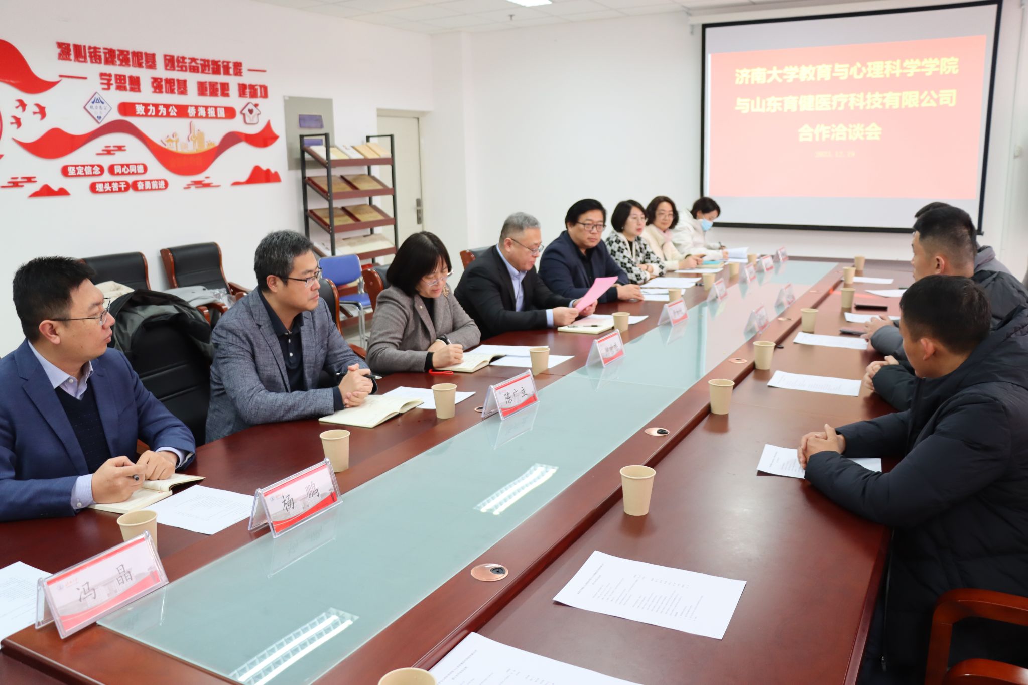 黄加栋对总经理邹雪茜和杜华民一行表示欢迎,感谢山东育健医疗科技有限公司的爱心善举,期待教育与心理科学学院与山东育健医疗科技有限公司联合成立研究院后能够开展更深层次的交流与合作,并表示济南大学一定会把这份爱心转化为发展的动力,用优异的育人成果来回馈社会。邹雪茜总经理感谢教育与心理科学学院给予山东育健医疗科技有限公司此次合作机会,公司后续将与学院在成果转化、人才培养、社会服务等方面开展合作,全力支持学院发展。