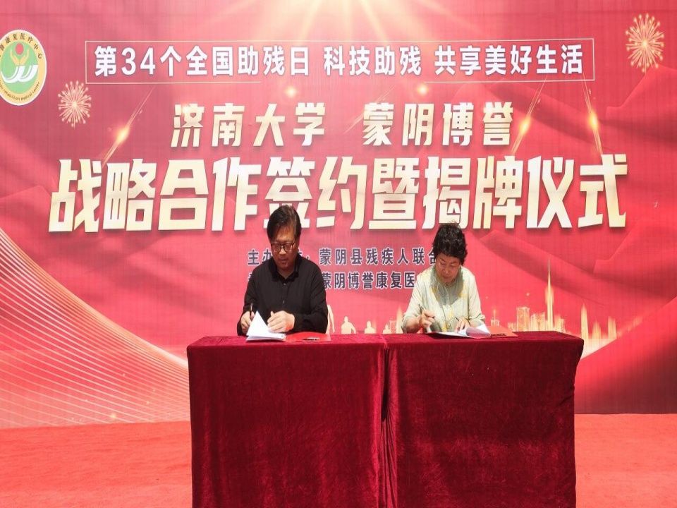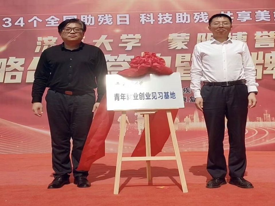 5月17日,在全国第34个助残日来临之际,济南大学教育与心理科学学院与蒙阴博誉康复医疗中心举行战略合作协议签约和“青年就业创业见习基地”及“大学生社会实践基地”揭牌仪式。蒙阴县委副书记、县长苗运全,县人大常委会副主任宋海荣,教育与心理科学学院党委书记季竹君、副院长李开云、学办主任卓华丽、研究生代表,蒙阴县残联、妇联、总工会、县委人才发展服务中心、县科技局、县人才工作集团、团县委、街道办事处等相关部门人员共同参加了揭牌仪式。本次活动由蒙阴县委组织部副部长、县编办主任、县公务员局局长侯进新同志主持。