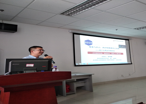 为增进学院19级特教专业新生对特殊教育的专业认识,拓宽教师的教学科研视野,学院邀请南京特殊教育师范学院张伟锋博士于9月24日,在特教楼302会议室,为我院师生做了《镜鉴与启示:两岸特殊教育之比较——基于台湾访学的经历》的报告,并与我院师生进行了交流。我院19级特教专业新生及部分教师参加了此次报告,讲座由特教系主任宿淑华老师主持。
