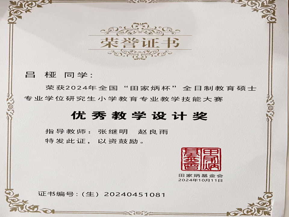 近日,2024年全国“田家炳杯”全日制教育硕士专业学位研究生“小学教育”、“特殊教育”领域教学技能大赛相继落下帷幕,教育与心理科学学院乔福强副教授指导的特殊教育专业研究生董婉晴、侯艳分别荣获全国一等奖、三等奖,张继明副教授指导的小学教育专业研究生吕桠获得“优秀教学设计奖”,乔福强老师获得“优秀指导教师”,学院代表济南大学取得了优异成绩。