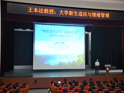 讲座开始,王教授对大一新生的到来表示了热烈的欢迎,在表达自己美好的祝福和期盼后,引出了本次讲座的主题——“Hold住青春,成就自我”。由于大学的生活与高中的模式截然不同,王教授从大学的理念、目标、内容、方法等方面漫谈如何适应大学生活,如何在这个全新的舞台度过充实的四年。当在座的新生对于“大学”这一名词有了一定的了解后,王教授还结合自己的亲身事例以及心理学的相关知识,着重强调“情绪管理”和“自律”的重要性。他谈到,在相对自由的大学,更要懂得控制自己的情绪,养成良好的生活和学习习惯。讲座最后,王教授鼓舞新生们在有限的青春年华里,成就最美好的自己。随着持久热烈的掌声的到来,本次讲座圆满结束。