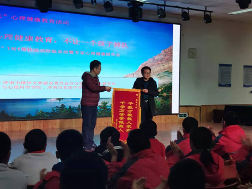 活动分两个时段举行。第一时段为心理学“小专家”1对1帮扶活动经验总结会,在党家中学四楼会议室举行。心理学“小专家”1对1帮扶活动是指每一个初一年级的学生在遇到心理问题时都会有一个心理学专业的“小专家”辅导答疑帮扶,济南大学教育与心理科学学院选派了心理学专业的9名本科生和5名研究生从九月份开始举办该项活动,取得了非常好的教育效果。经验总结会参加人员为党家中学龚学亮副校长、初一级部主任、全体没有课的班主任以及参加1对1帮扶活动的没有课的“小专家”。龚校长对小专家的活动成效给予了充分肯定,级部主任和班主任对即将结束活动离开学校的小专家们表示了依依不舍之情,小专家们纷纷发言,表示此项活动意义非凡,不仅帮助了初一的孩子们,也促进了自己的专业成长,并对该项活动的继续开展提出了意见和建议。第一阶段会议结束后,第二时段报告会之前,乔福强博士代表学院向党家中学赠送了锦旗。