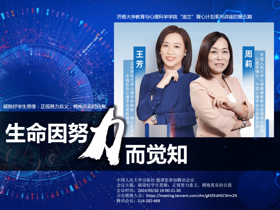 为深入探讨学生努力与生命意义之间的关系,鼓励学生们正视努力的真正价值,拥抱真实的自我,学院应用心理专业于2024年5月20日通过腾讯会议举办了“滋兰”育心计划系列讲座第五期——“生命因努力而觉知”。本次讲座吸引了心理专业学生的积极关注,共同聆听北京师范大学王芳教授和人民大学周莉教授的精彩发言。